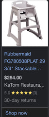 $200ea. / Rubbermaid Stackable Plastic High Chair w/ Waist Strap & Casters, Platinum / Restaurant Equipment / Great Condition