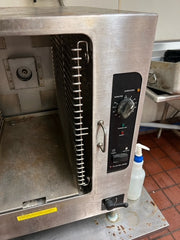 Steam is forced around the compartment with a fan, and when the door is opened during the cooking cycle, the fan and steam are shut off. Its water level is monitored with low and high water probes. To maximize heat transfer, the heating element is in an aluminum block. The Cleveland 22CET6.1 SteamChef electric countertop steamer has a stainless steel door and latches that withstand constant use in commercial settings. The water reservoir has a 1-gallon capacity.