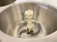 Designed to rest on the floor, the Hobart HCM450-3 cutter mixer supports high-volume vegetable prepping needs. Its body is made of stainless steel wrapped in an epoxy coating and rests on a series of legs stamped in rubber at the end to protect the floor from scuffs. Its bowl has a capacity of 45 quarts, which is ideal for cutting massive amounts of fruit and vegetables; when operators need to retrieve the sliced product, they can tip the bowl on its hinge and pour it into a waiting receptacle. The bowl can then be sealed back up using the clear Lexan cover. To remove unwanted liquids from processed product, it ships with a poly strainer bowl.