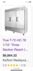 $5500 / 2021 True T-72 Stainless Steel Refrigerator / Never Used