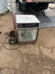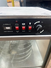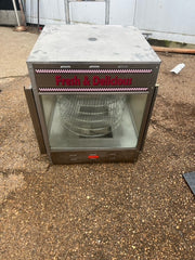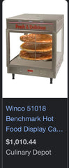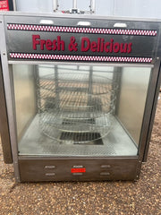 Benchmark Hot Food Display Case, countertop, pass-thru, 24"W x 28"D x 33"H, 3-tier rotating hook rack for pretzels, 5-tier rotating shelf rack for 18" pizzas, adjustable thermostat, humidified, 4 qt. water reservoir, graphic, includes (1) pan rack & (1) hook rack, stainless steel construction, 4" legs, 1480 watts, NEMA 5-15P, 120v/50-60/1-ph, 12.3 amps, cETLus, ETL-Sanitation